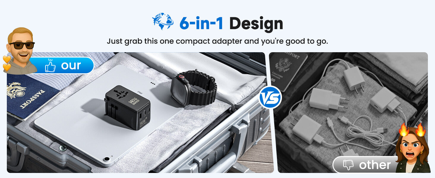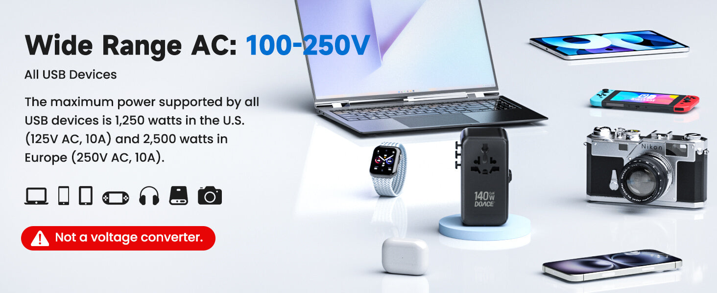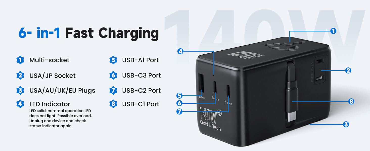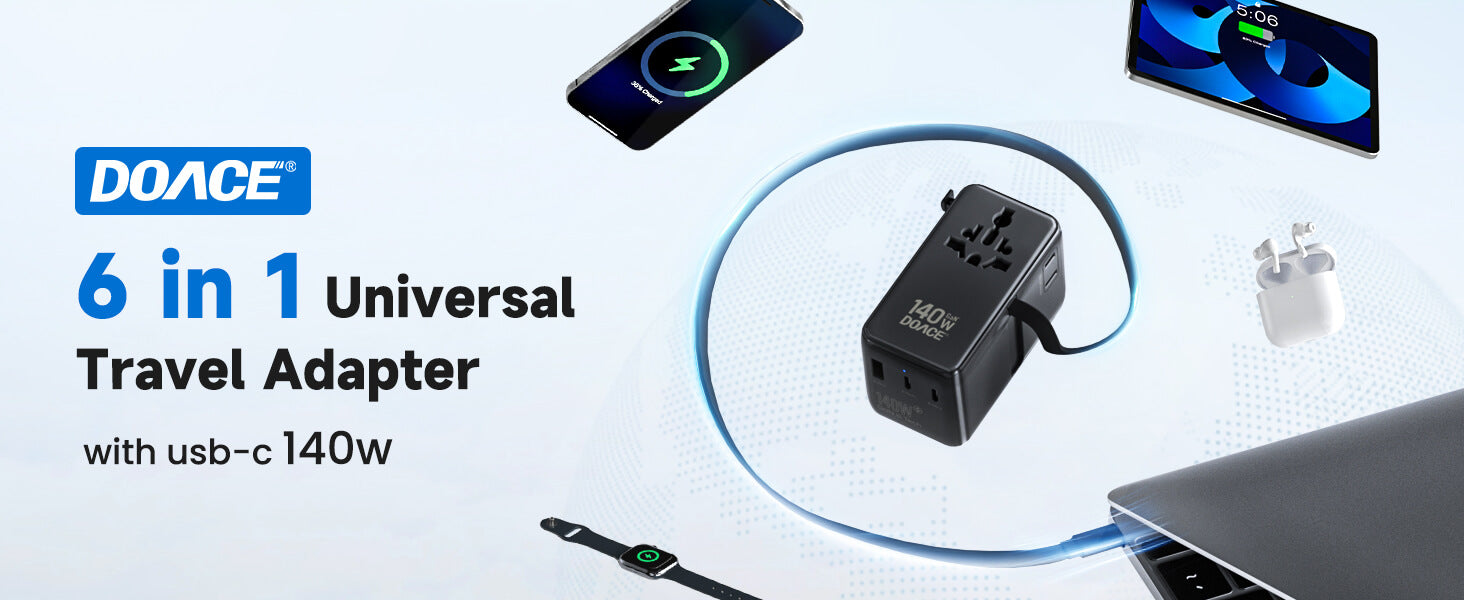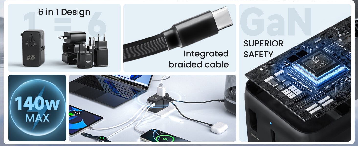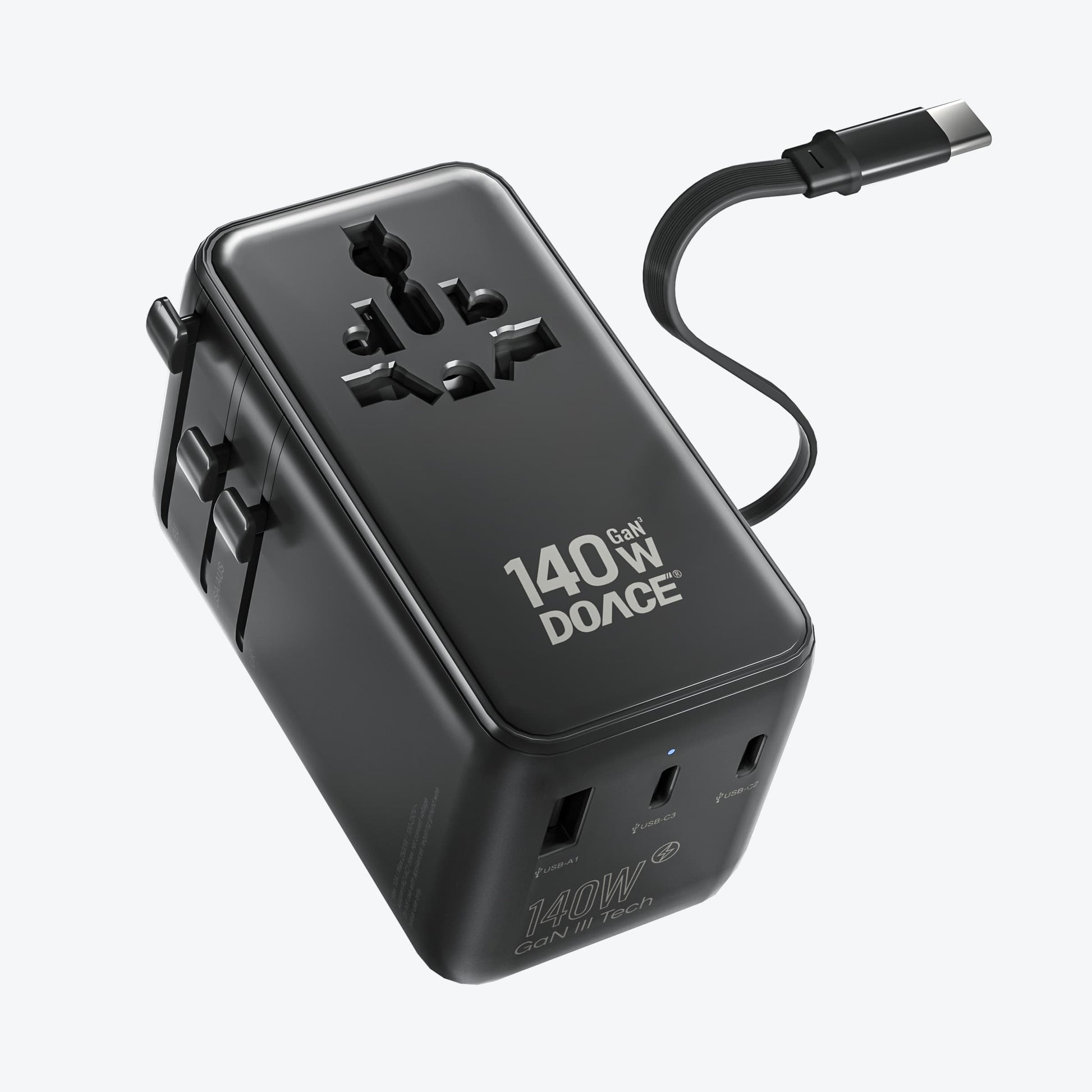DOACE 140W GaN Travel Adapter - 6-in-1 Worldwide with Built-in USB-C