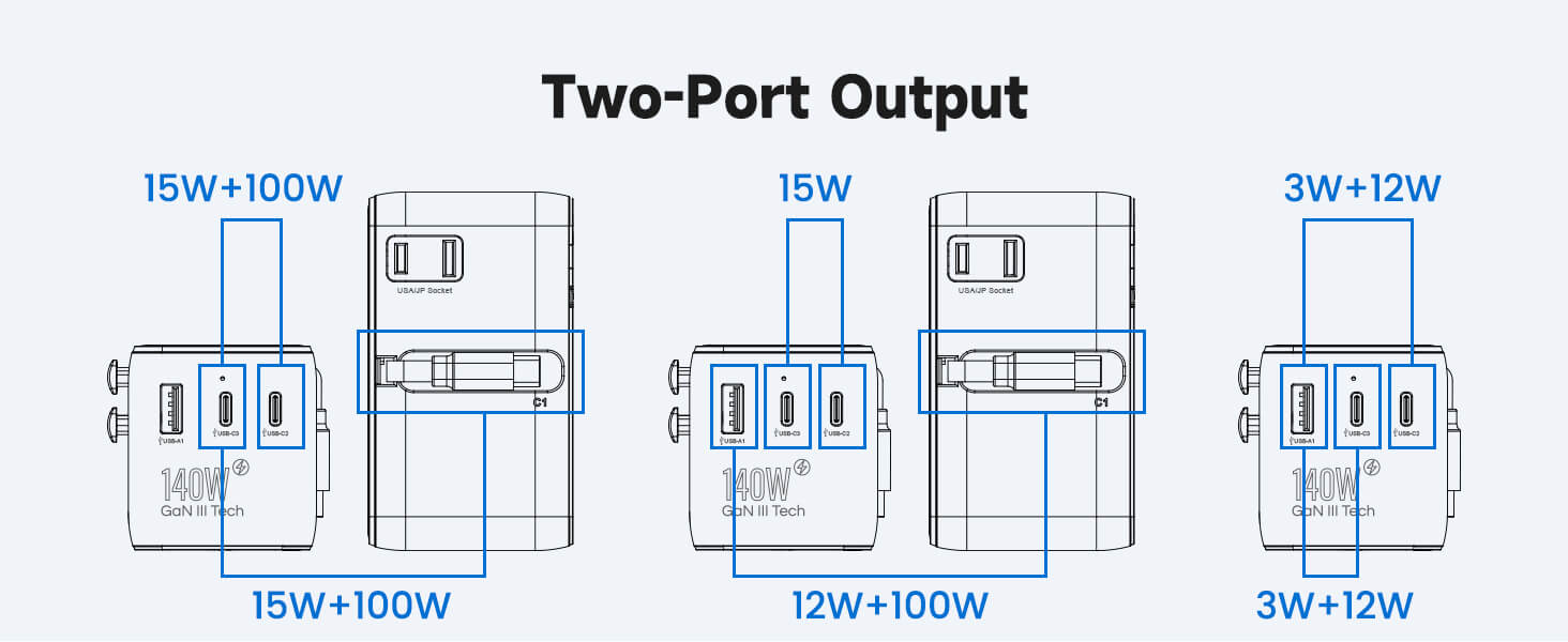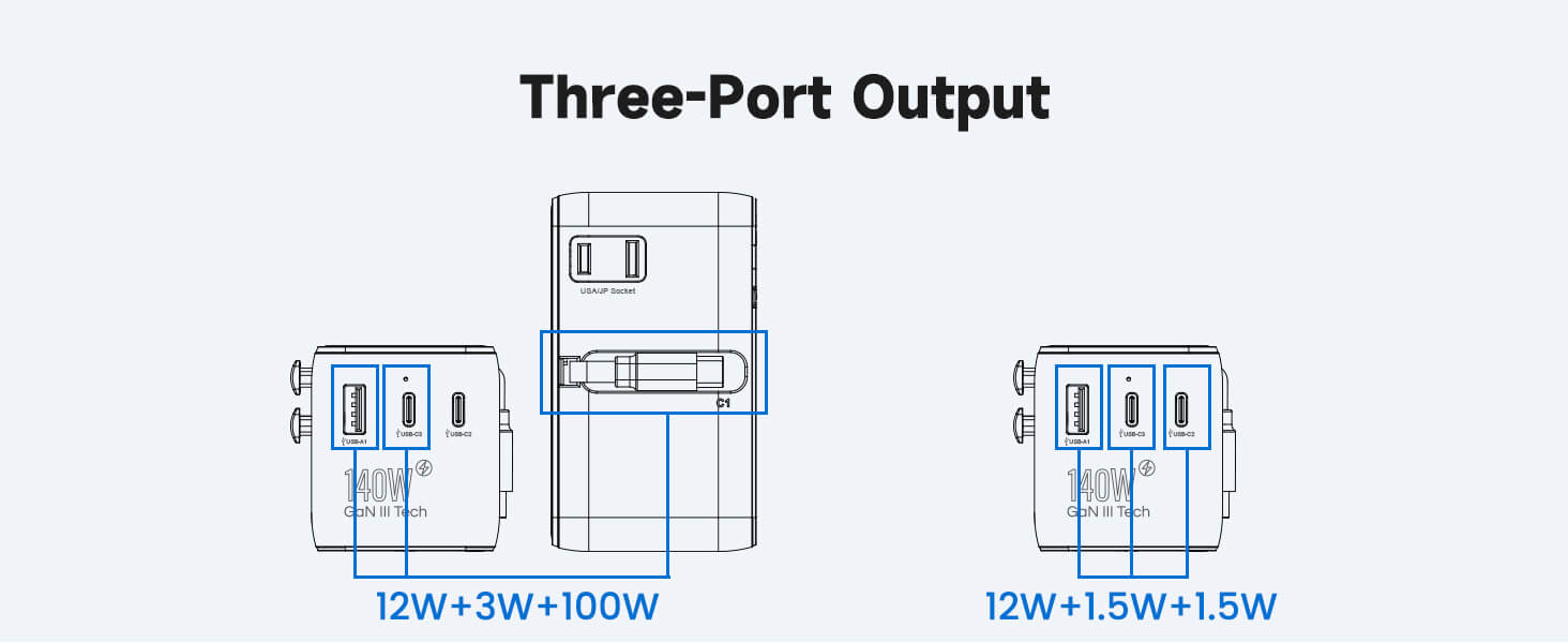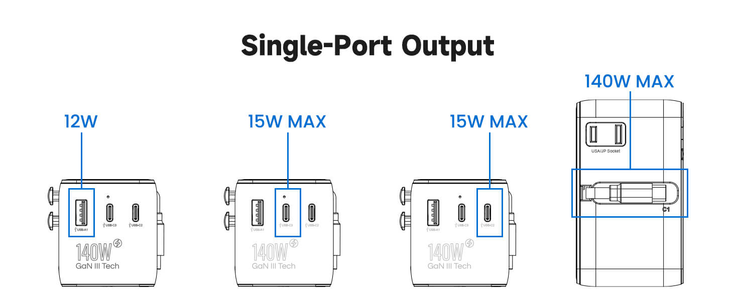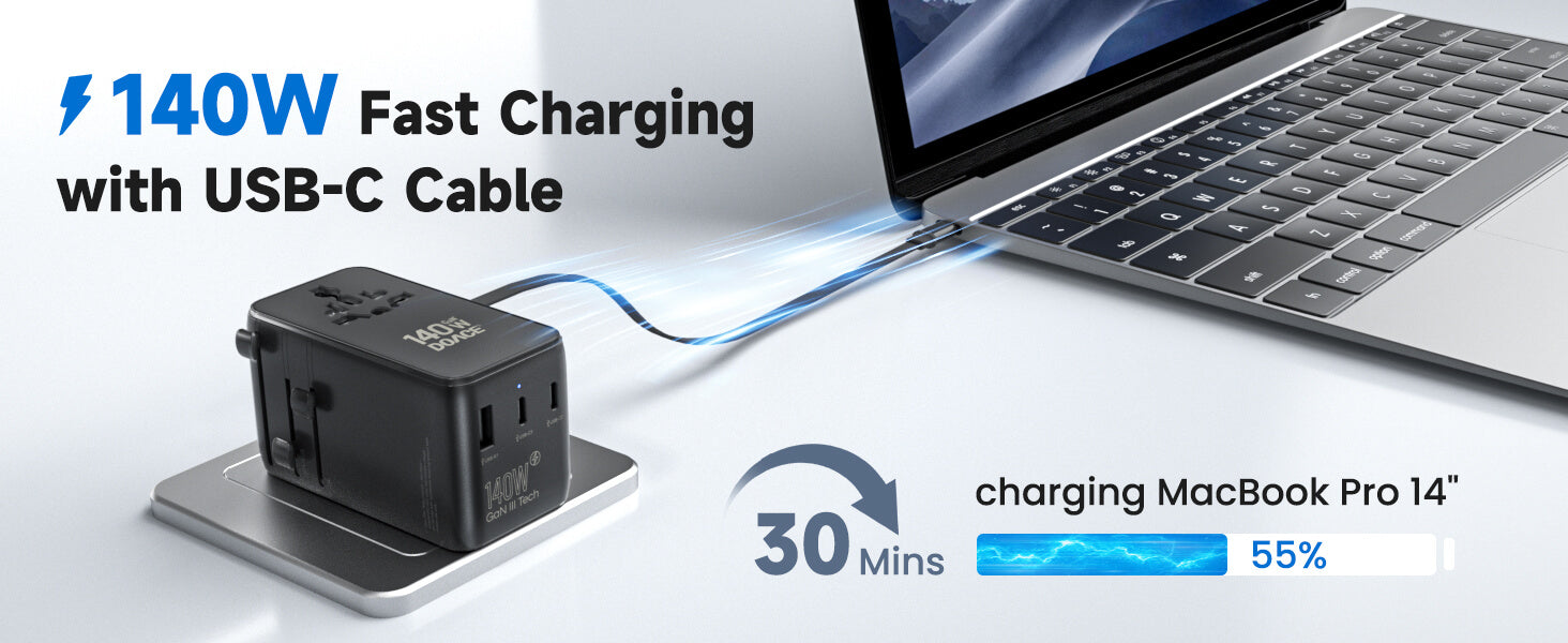 USB-C1 port delivers 140W max (charge a MacBook Pro 16" to 55% in 30 mins). GaN3.0 technology ensures compact size with superior heat dissipation vs traditional chargers.