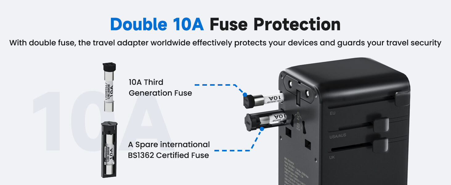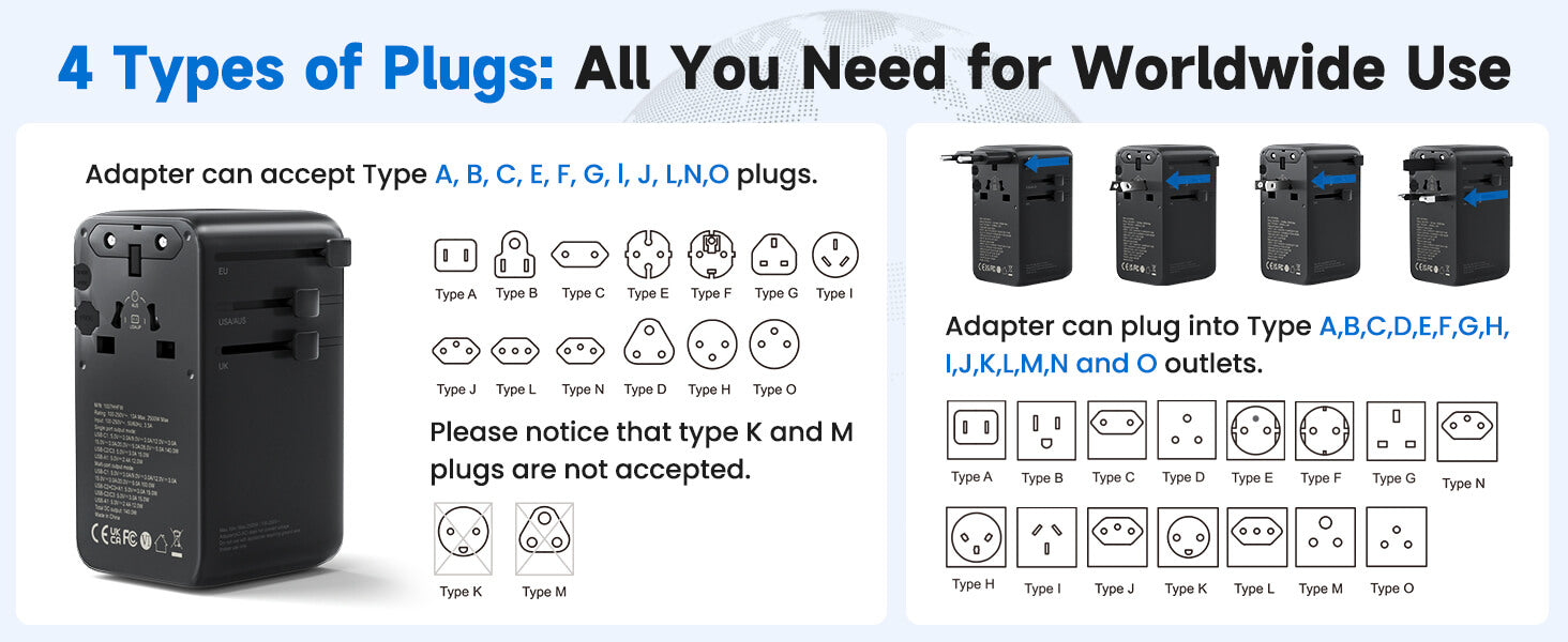 GaN 3.0 Universal travel adapter includes Type C (EU), Type G (UK), Type I (AU), and Type A (US) plugs, covering 200+ countries. Perfect for Europe (Germany, France, Italy), the UK (England, Scotland), Asia (China, Japan, Singapore), Australia/New Zealand, and the Americas (USA, Canada). Stay connected wherever you travel—from Tokyo to Paris.