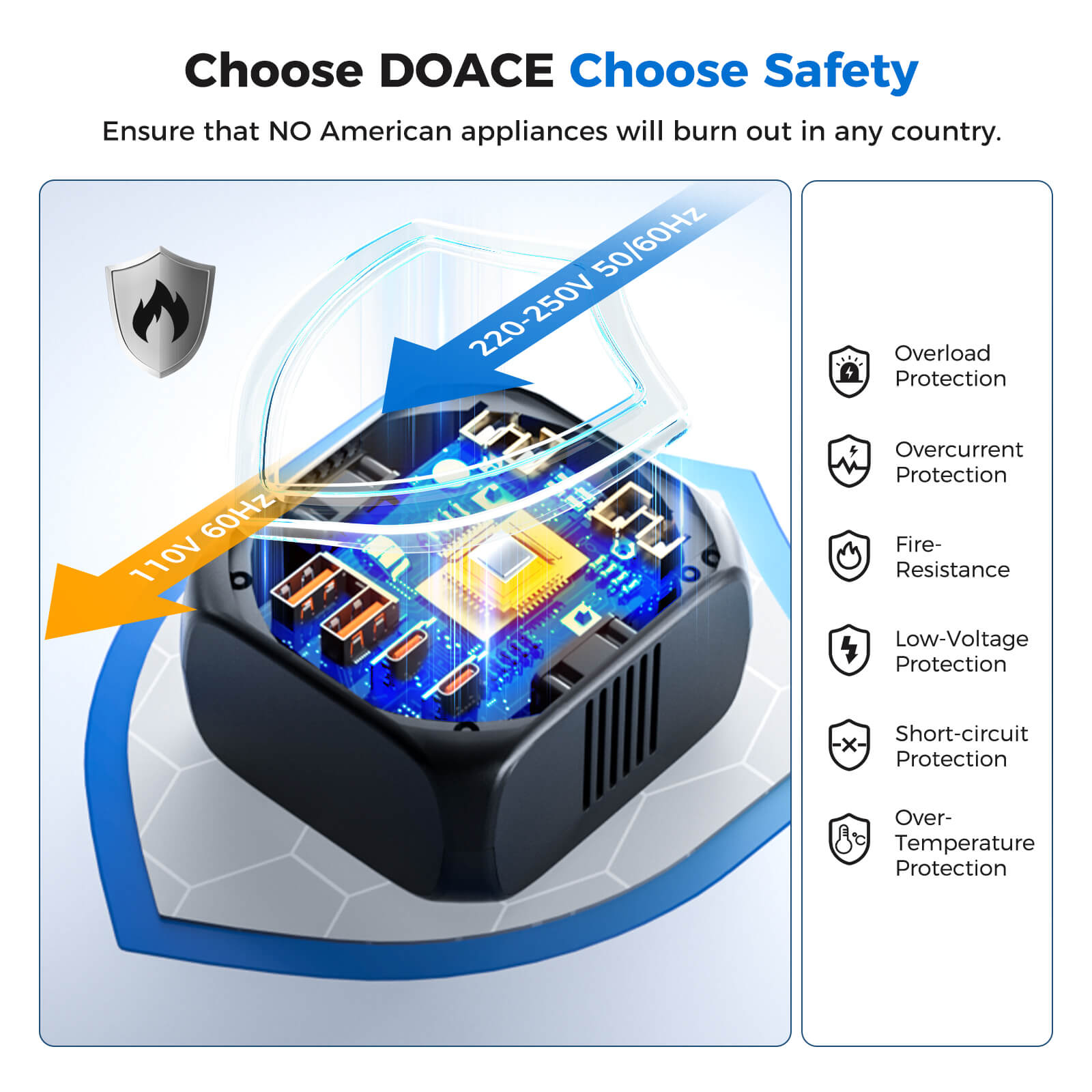 Unlike regular international power adapters that only change the plug shape, the DOACE C15 is specially engineered for American travelers. Our advanced circuitry safely steps down foreign voltage (220-240V) to US standard voltage (110-120V), ensuring your American devices work properly in over 200 countries worldwide.