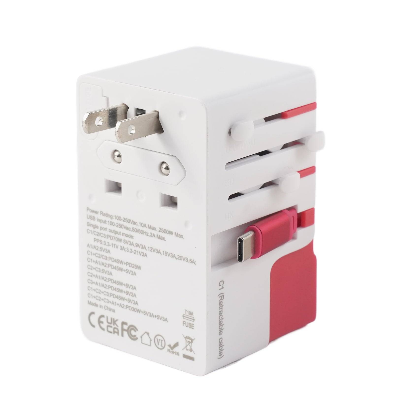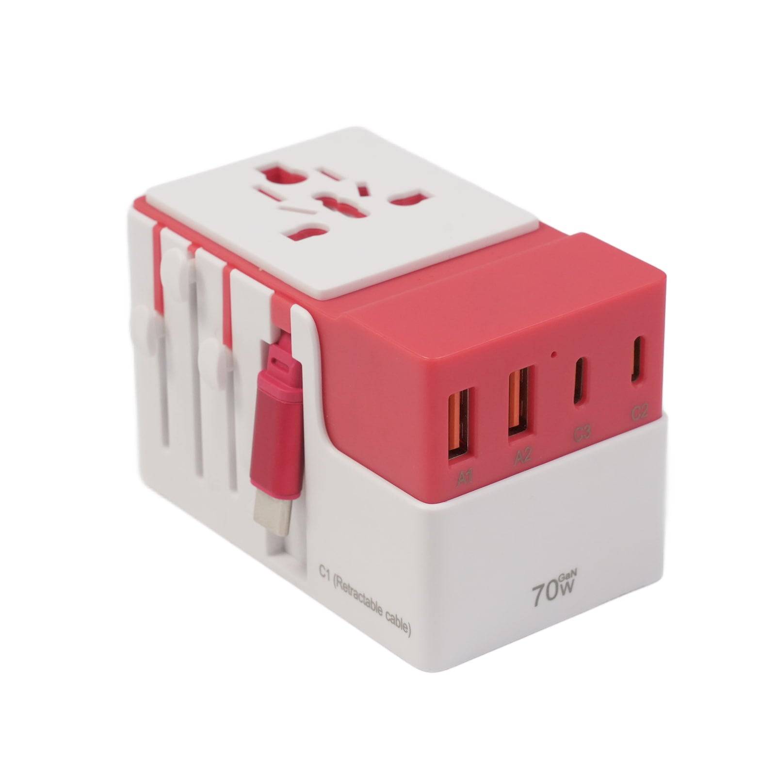 Upgraded GaN charger with 3 USB-C and 2 USB-A ports, featuring a built-in retractable USB-C cable for unmatched convenience and versatility in global travel charging needs.
