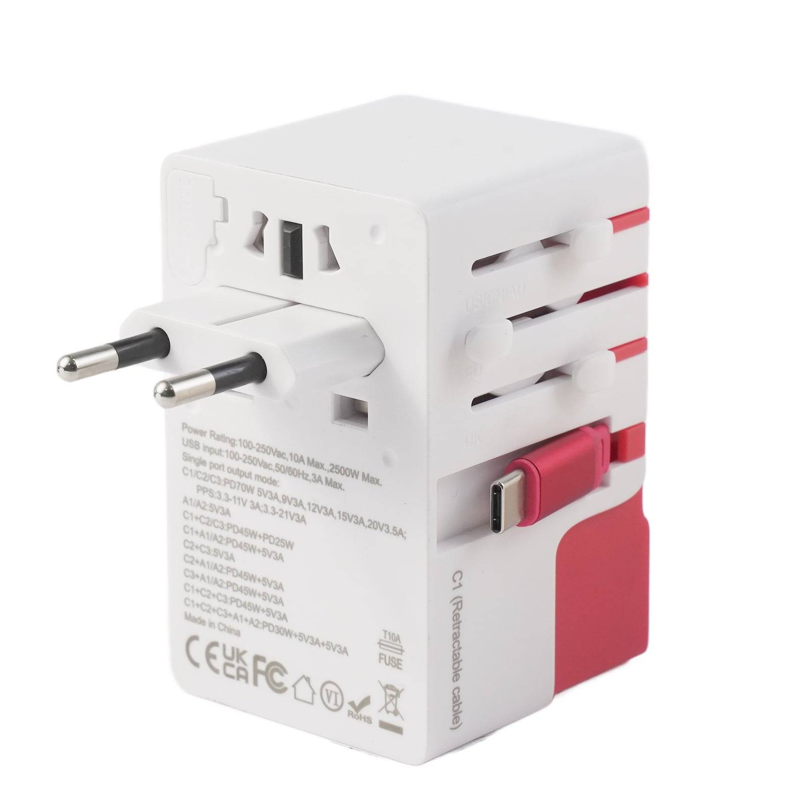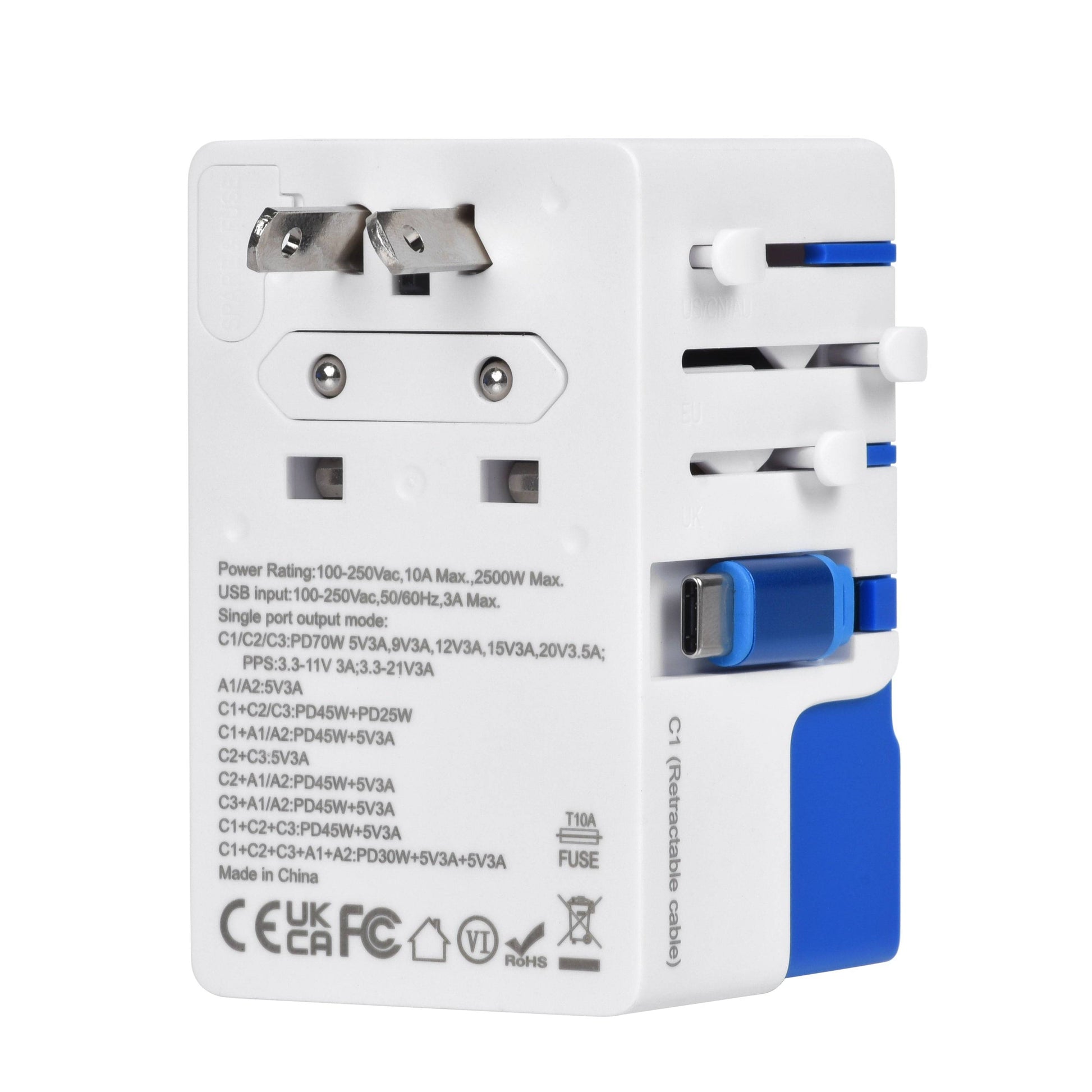 Comes with US/AU/EU/UK plug types and a universal AC socket (unearthed), ready for global use:
